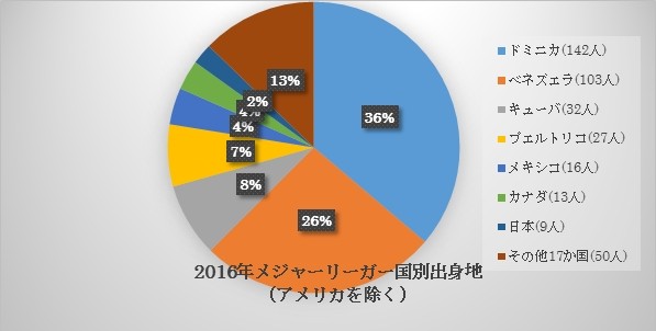 しかしながら、2016年メジャーリーグでプレーをした日本人は9人。これはアメリカを除いた海外出身選手全392人中の約2%にしか満たず、ドミニカ、ベネズエラ、キューバ、プエルトリコ、メキシコ、カナダに次ぐ7番目の数字です。