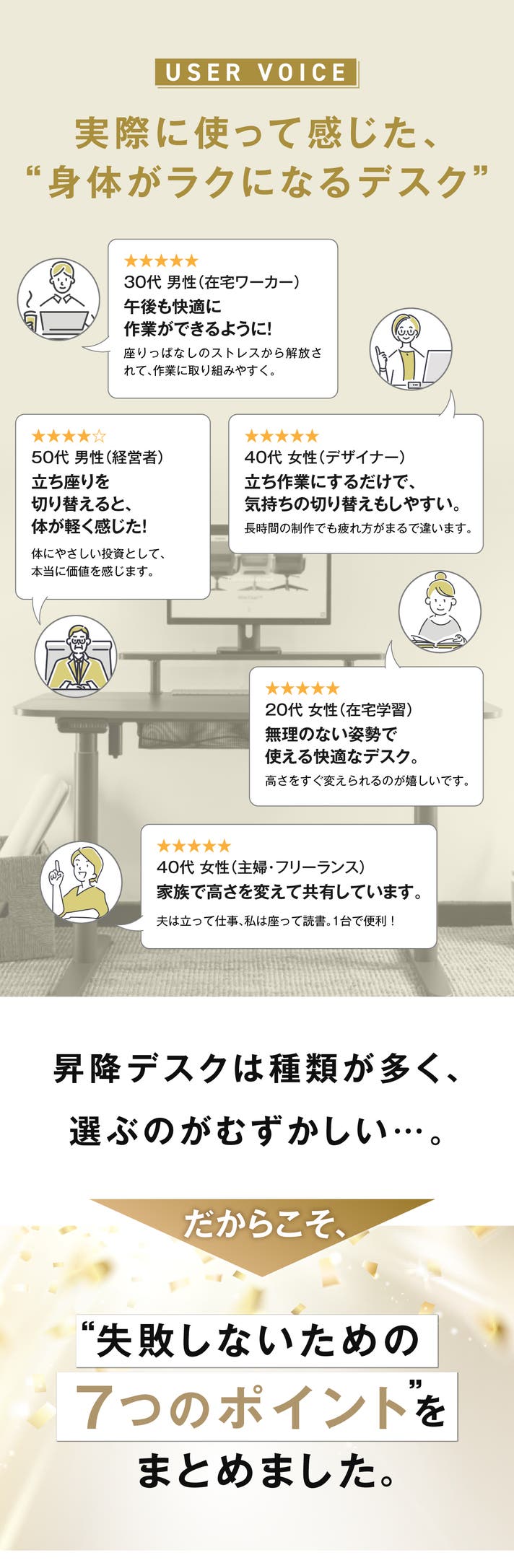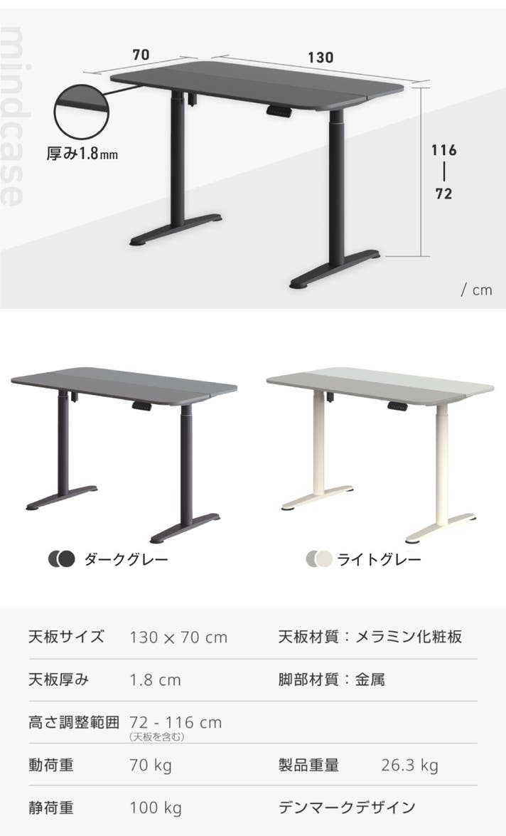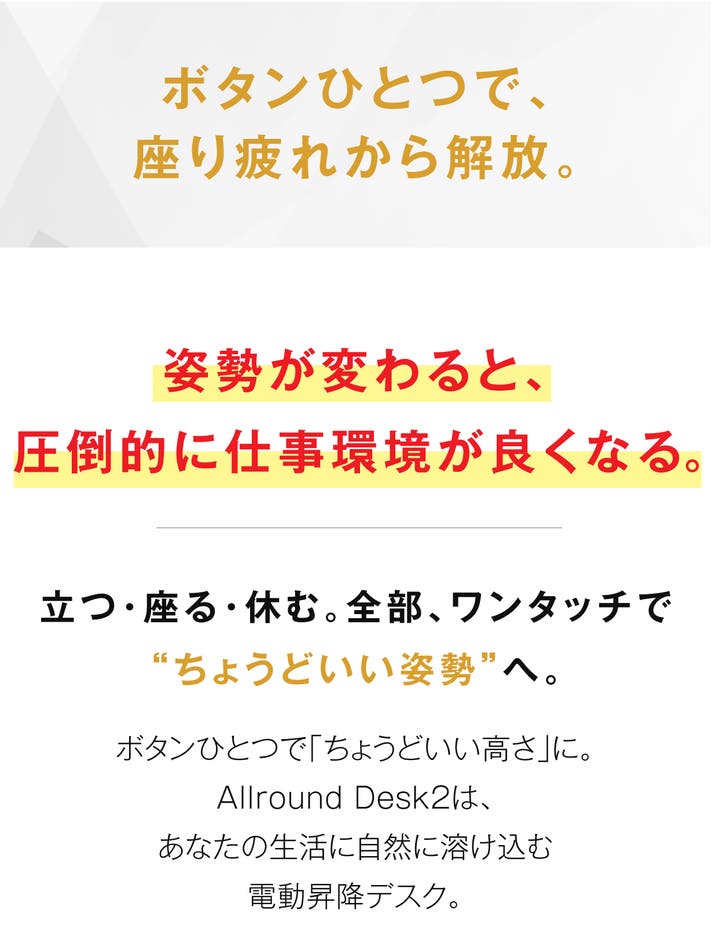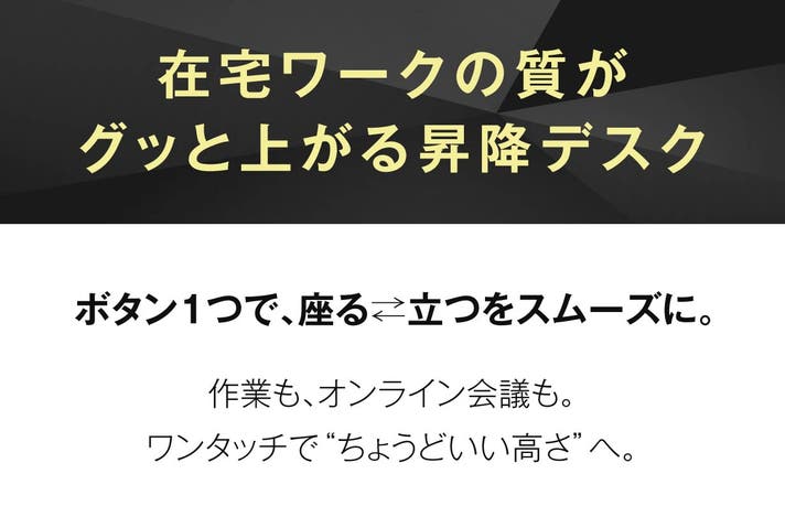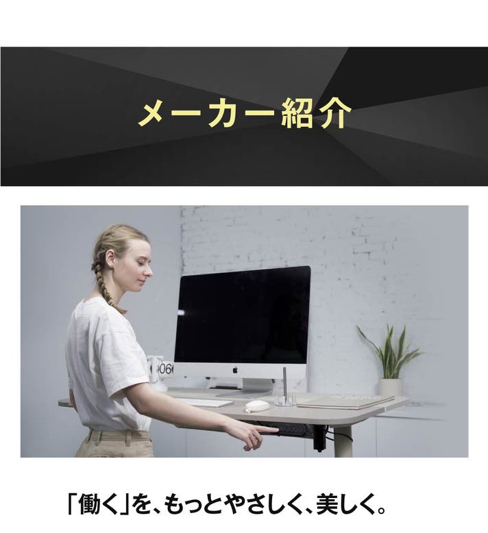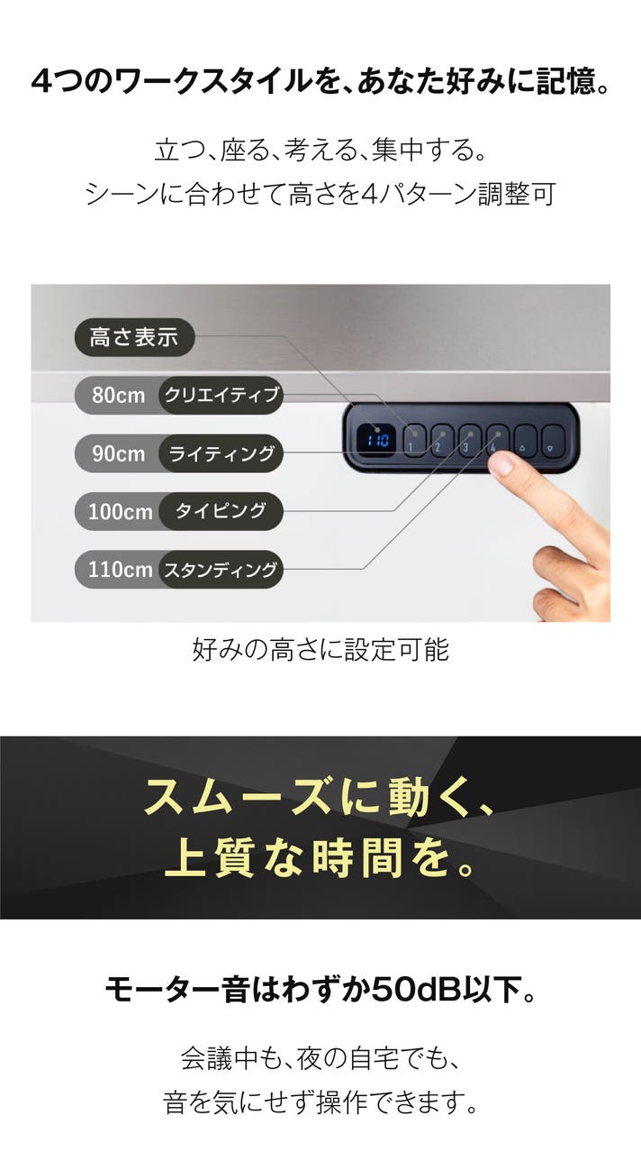 A. 長時間同じ姿勢による負担を減らし、“立つ×座る”を自然に切り替えられるワークデスクです。動作音に配慮したモーター、安定した構造、4つの高さメモリ、ゆとりの天板など、日常使用での使いやすさを重視しています。