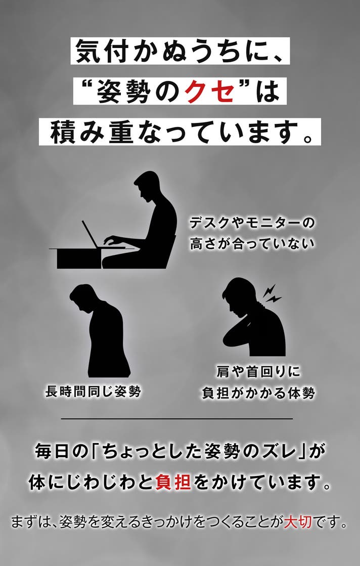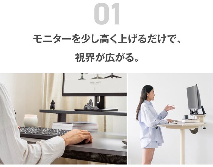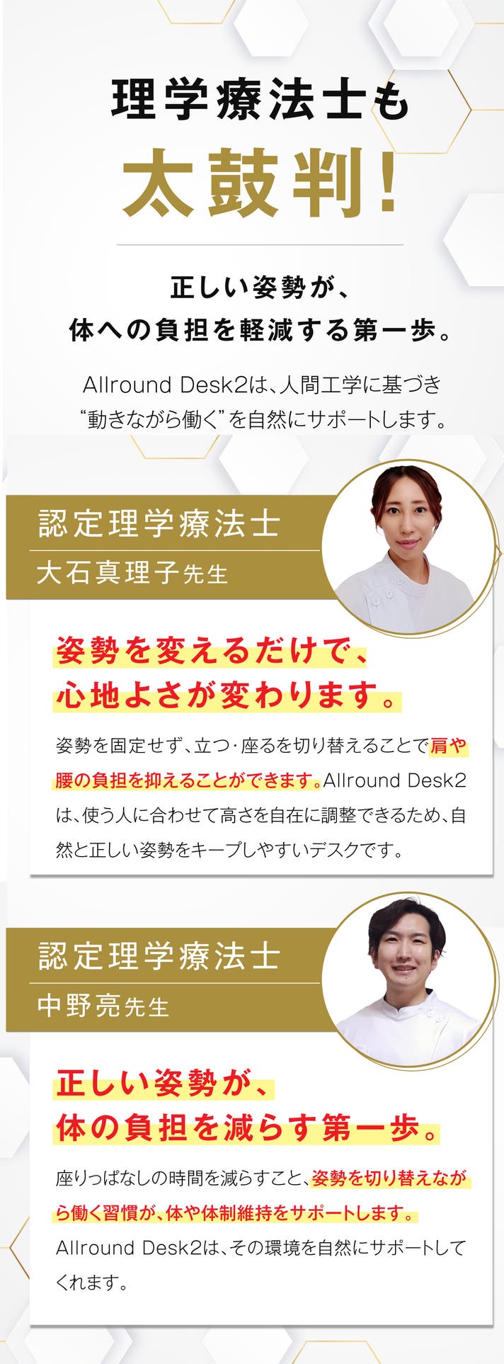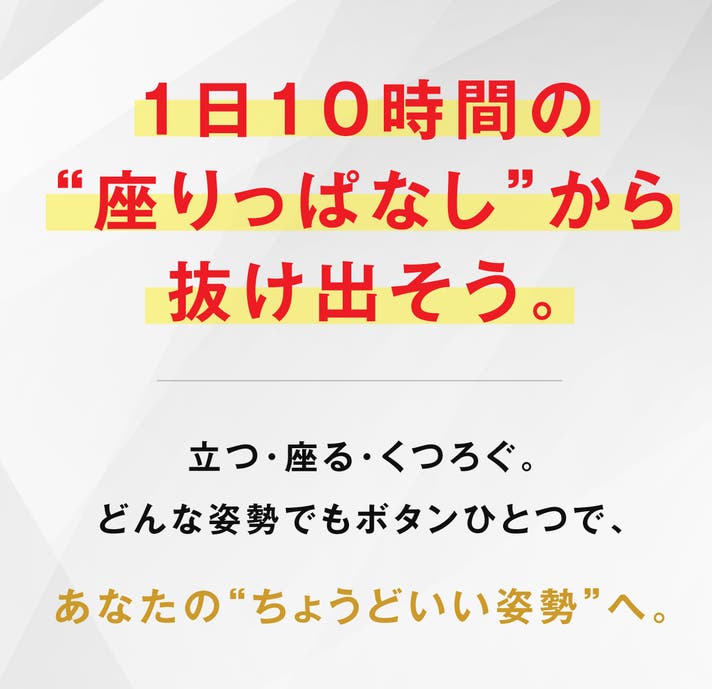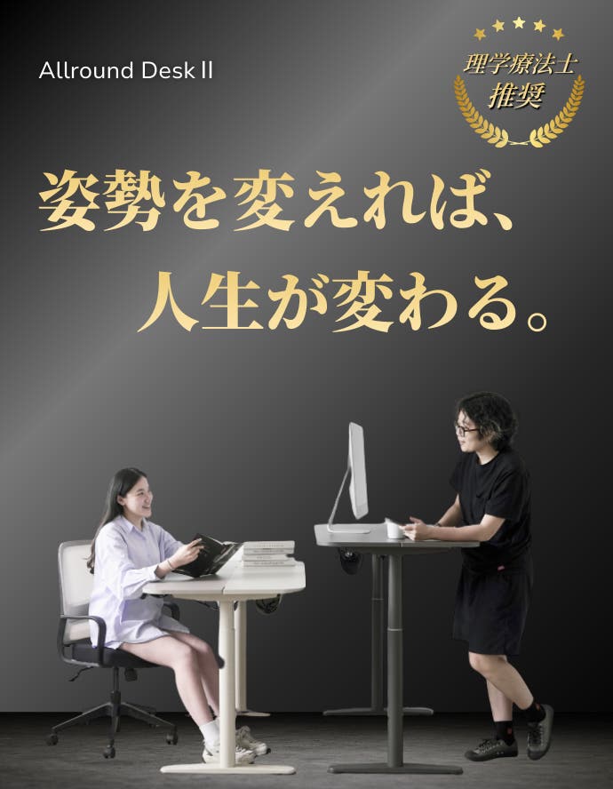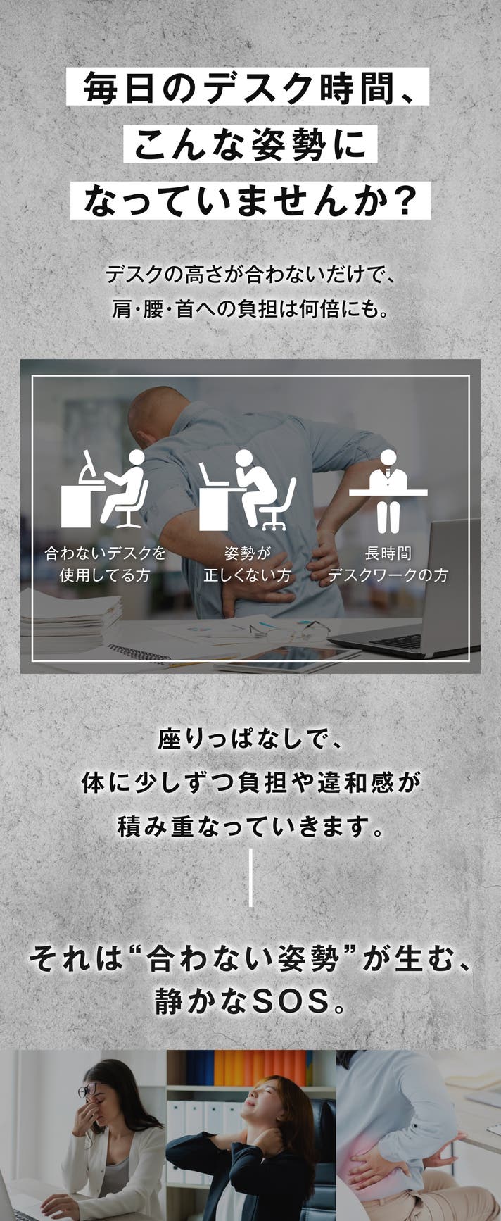 A. 本製品は医療機器ではありませんが、 同じ姿勢が続く負担を減らすことを目的にした設計です。立ったり座ったりを切り替えることで、腰・肩・首の負担を減らしやすい環境を作れます。