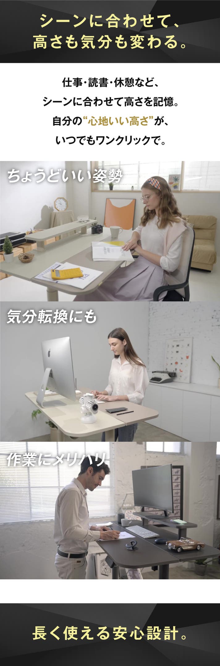 - 立つ・座るをワンタッチで切替え、自分に合った作業環境をつくりやすい新しいワーク習慣。