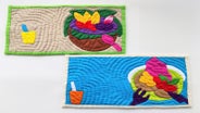 作業工程で余った布切れを使って大胆にデザインした、いわゆるクレイジーキルトの手法による製品も制作しています。こちらの製品もぜひご覧ください。