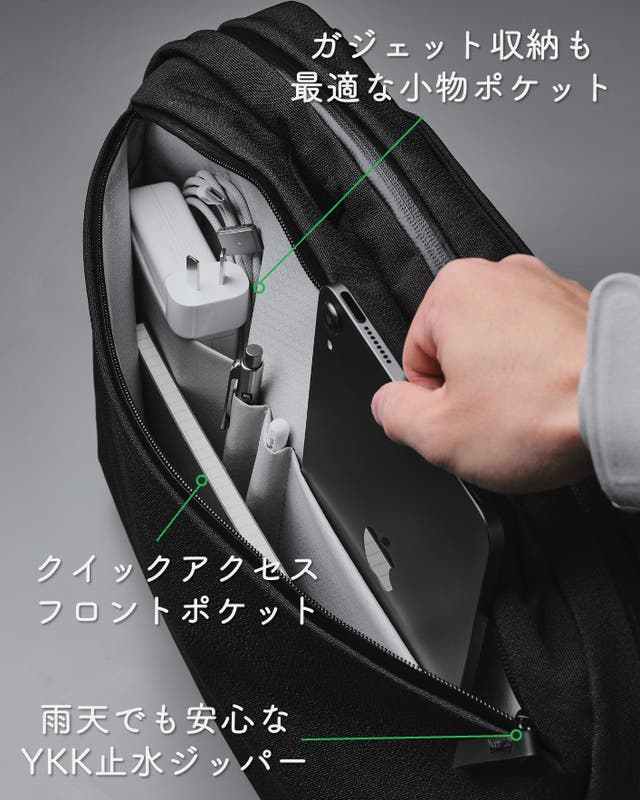 クイックアクセスフロントポケットには、その名の通りクイックに出し入れしたいアイテムを収納可能。