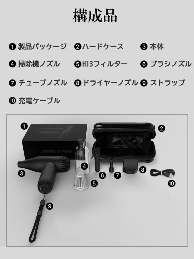 <アルファ エアガン> 構成品として、エアガン本体に専用ハードケース、掃除機ノズル、フィルター、ブラシノズル、チューブノズル、ドライヤーノズル、ストラップ、すべて含まれています。