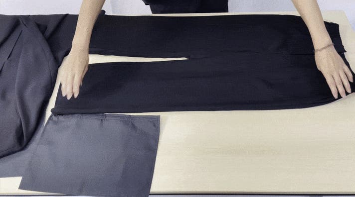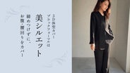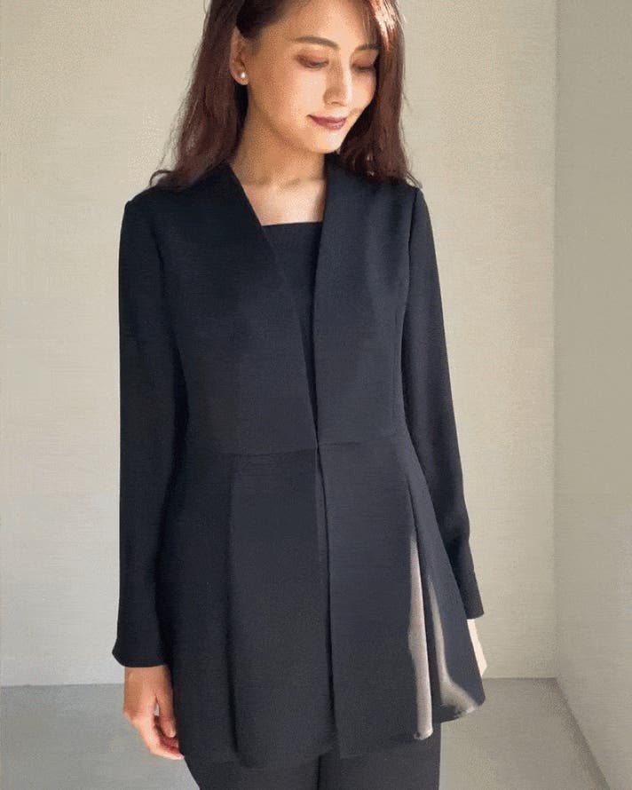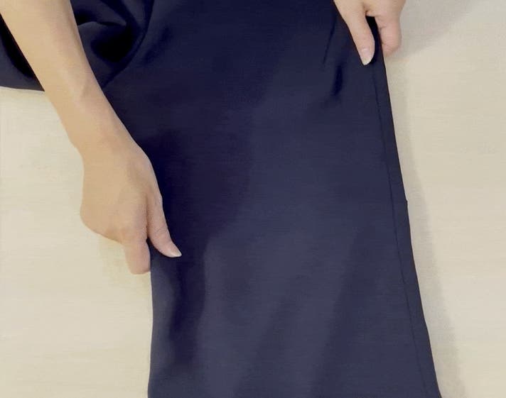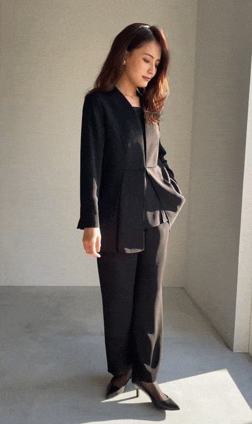 - シワになりにくく畳んで持ち運べる|ジャケット・ブラウス一体型にしたインナーいらずのパンツスーツ