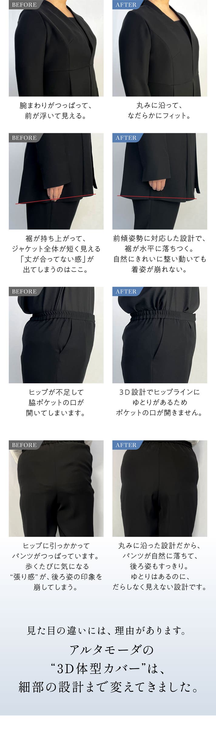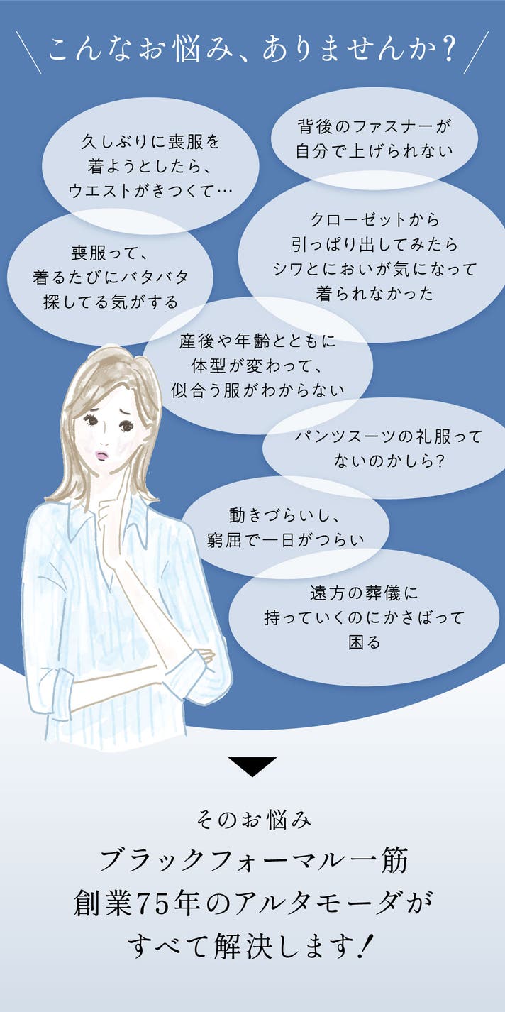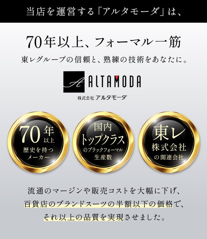 私たち「アルダモーダ」は、百貨店や量販店への卸経験をもつ、フォーマル専門メーカーです。創業70年以上、ブラックフォーマル一筋で、 “着やすく、美しく、安心して着られる一着”を追求し続けてきました。