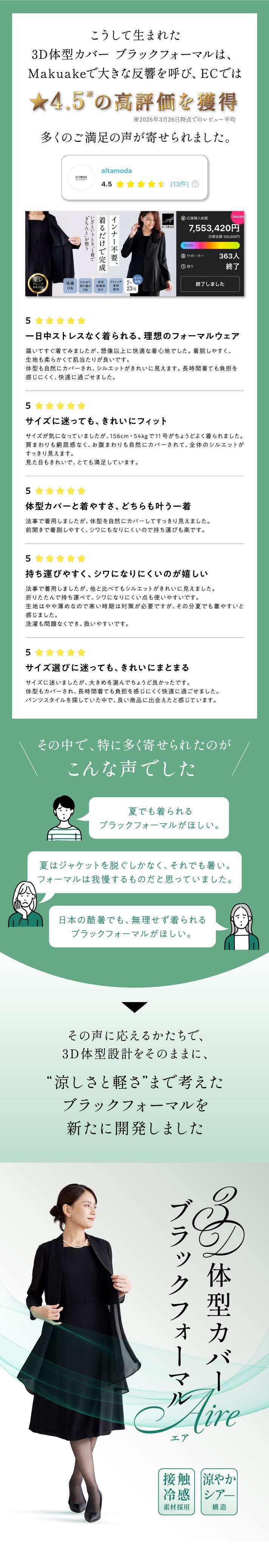 「Makuake(マクアケ)」は、実行者の想いを応援購入によって実現するアタラシイものやサービスのプラットフォームです。このページは、 ファッションカテゴリの 「【夏でも涼しい】肌を隠しても涼やかに。3D体型カバー ブラックフォーマル」プロジェクト詳細ページです。