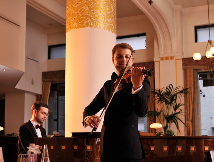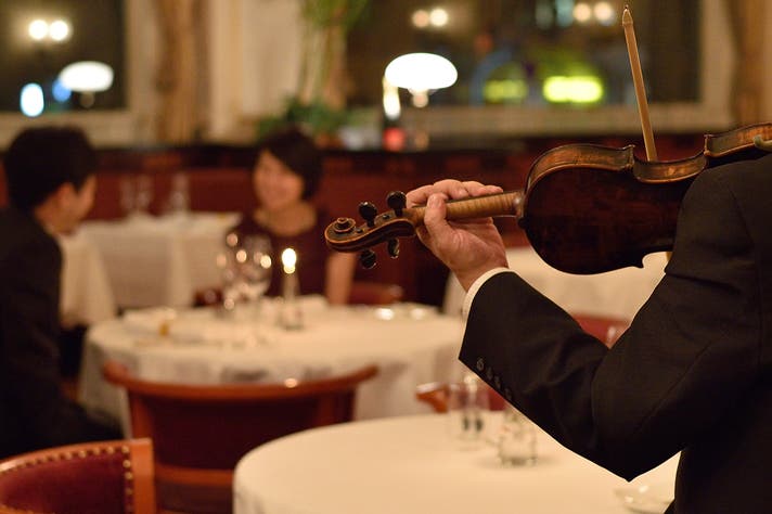 毎晩、ウクライナ出身の演奏家によるヴァイオリンとピアノの生演奏が響く店内で、日本各地から厳選した四季折々の食材を用いたコース料理をお楽しみいただけます。現在はウクライナから招いたプロの音楽家が演奏しています。今回のプロジェクトの応援購入の一部は、ウクライナ人演奏家たちの継続的な招聘にも活用いたします。