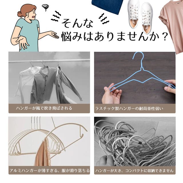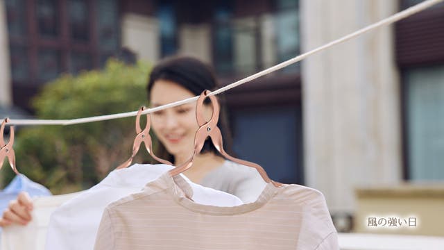 風によりハンガーが飛ばされたり動いてしまったりするのを防ぎます。マンションでの外干しや、外出時の天日干しにも安心です。