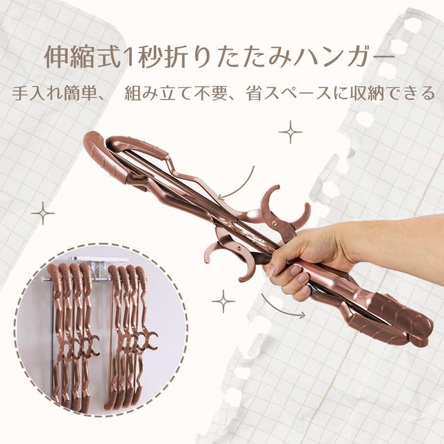 伸縮自在!収納しやすい折りたたみ式アルミクリップハンガー。強力で竿にガッチリ固定!グリップ式で、風の強い日でもハンガーがとばされないので安心です。