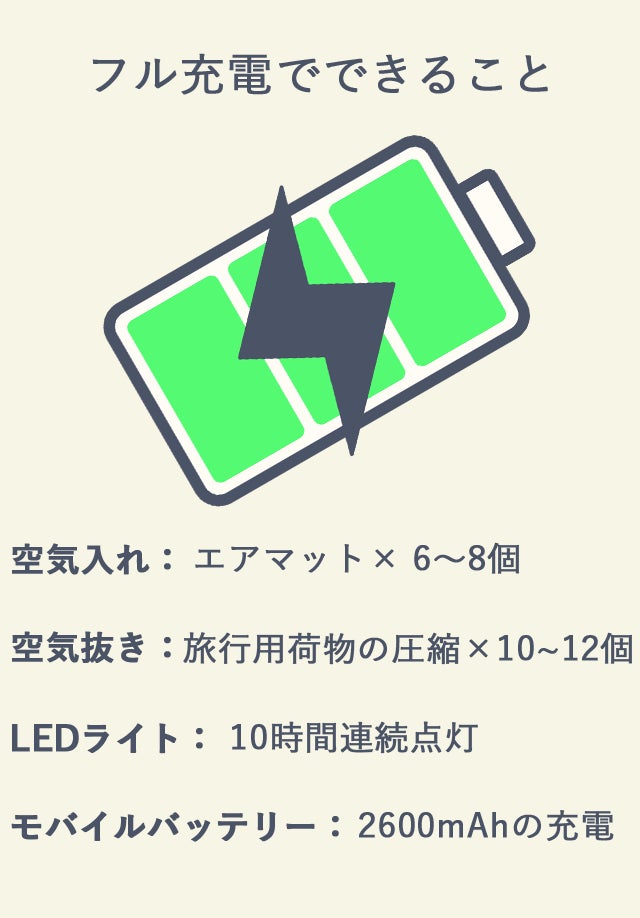 1回のフル充電で、衣類を12回圧縮、エアマットレスを8回膨らませることができ、暗闇を10時間照らすことも可能です。