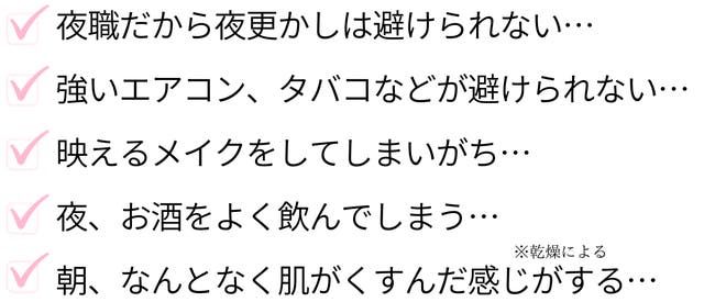 みなさん、知っていましたか?これらの悩みに 共通するのは乾燥によるくすみが原因です。特に夜職の方はずっと空調の効く部屋にいる為、特にお肌が乾燥しやすくなります。