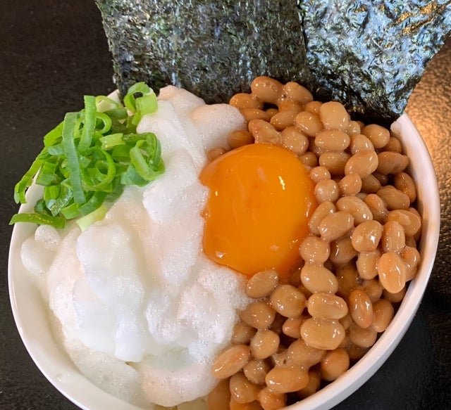 【食材:小粒納豆、卵(黄身とメレンゲ)、青混ぜ海苔、焼き海苔、ネギ】