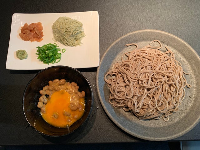 【食材:大粒納豆、お蕎麦、黄身、とろろ昆布、梅肉、わさび、ネギ】