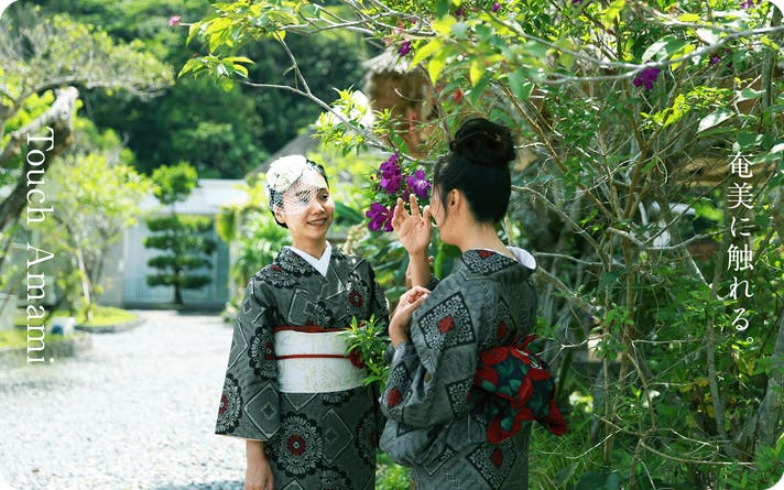 大島紬の着付けと1日レンタルのプラン。洋服の上から本場奄美大島紬の着付けをいたします。世界三大織物、日本三大紬の一つに数えられる高級織物「本場大島紬」を気軽にお召しいただけます。