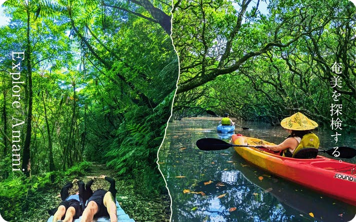 海のイメージが強い奄美大島ですが、実は森や川の自然もいっぱい。今回のチケットでは、「ヒカゲヘゴの森散策」と「マングローブカヤック」の2本立てで奄美の自然を満喫できます。