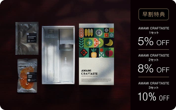 プロジェクトスタートから早い段階で応援していただける方への感謝として、早期購入割引をご用意しました。「AMAMI CRAFTASTE 」を1セットご購入の場合は5%OFF(60セット限定)、2セットの場合は8%OFF(30セット限定)、3セットの場合は10%OFF(20セット限定)で購入いただけます。