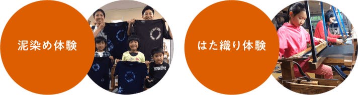 古代から伝わる伝統の染色方法で 自分だけのオリジナルアイテムを作ろう!輪ゴムなどで素材が染まらない部分を作っておき、何度もテーチ木の汁や石灰水で染めた後、泥田の中で染めていきます。3点1,000gまで染める物をお持ち込みいただけます。