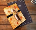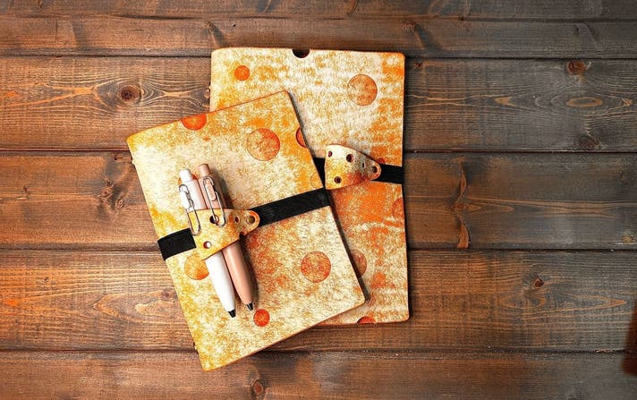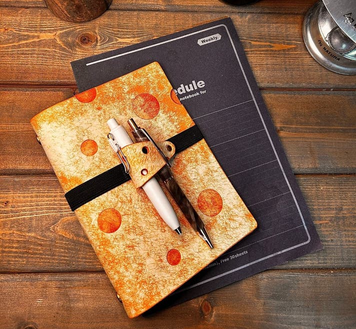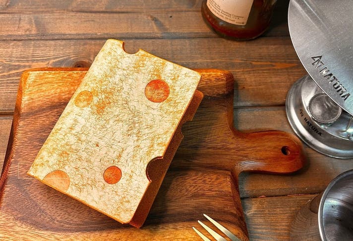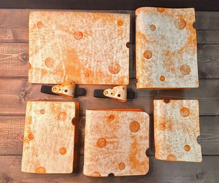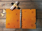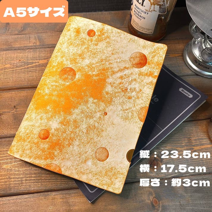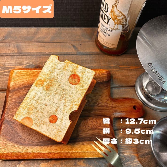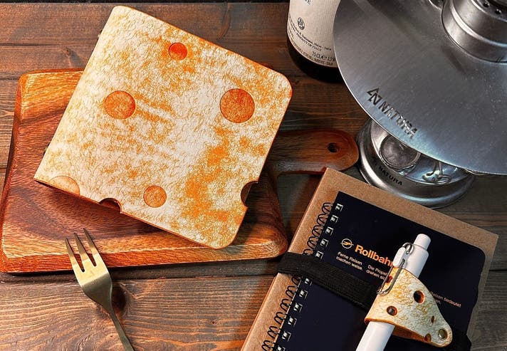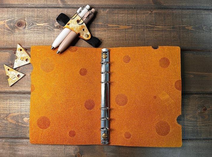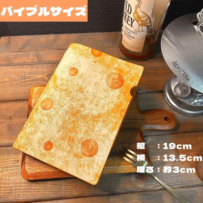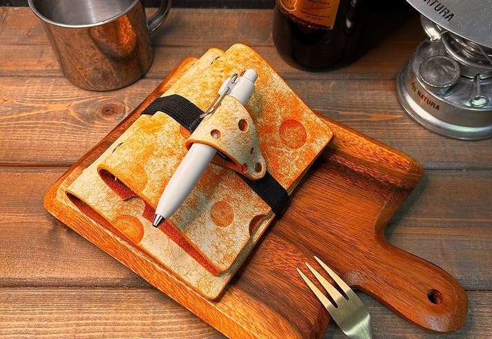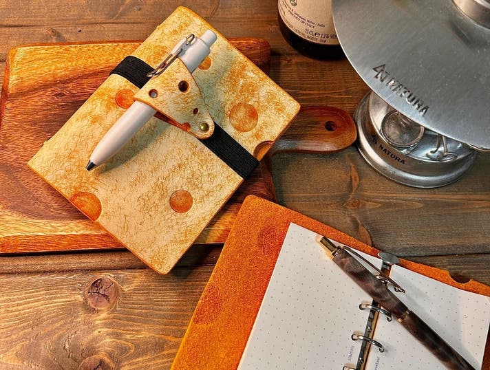 穴あきチーズをモチーフにしたシステム手帳と、太軸ペンもすっきり収まるブックバンドペンホルダーのセットです。