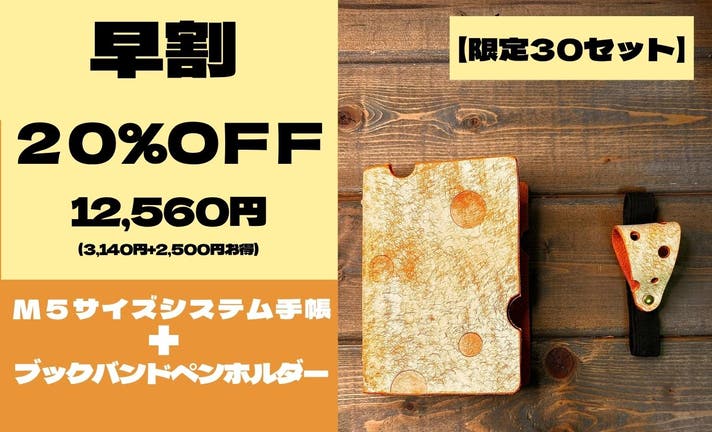 ・M5サイズ革チーズのシステム手帳× 1点[一般販売予定価格 15,700円の20%OFF]+ブックバンドペンホルダー(2,500円相当)