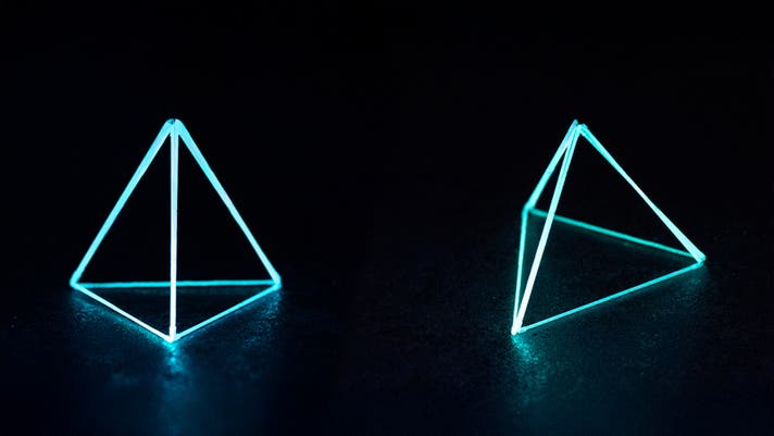 ここでも特許出願中の技術を使い。繊細な約1mmのガラス管に特殊な方法でオリジナル蓄光液を封入。太陽や月から光を集めたり電気やUVライトで、より力強く光るピラミッドが誕生。