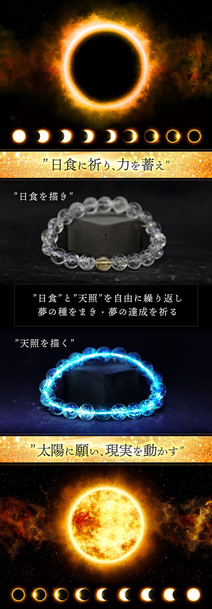 「日食に願い・太陽に誓う」太陽の巡りは、生命力や活力と密接に関係するとされる重要な周期。Ra'Solは強制的に太陽の輝きを繰り返し腕輪に宿します。