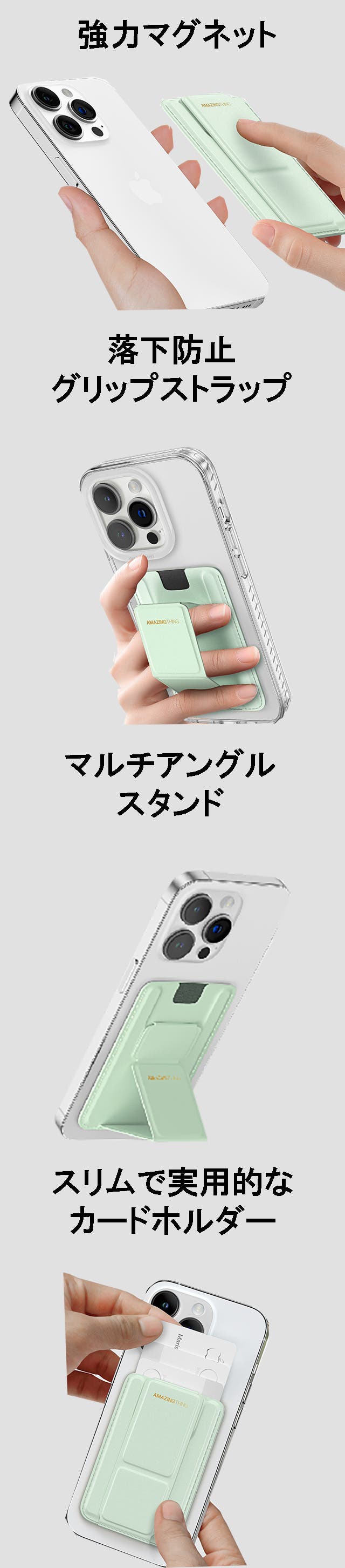 - マグネットでピタっと、スマホに着脱も自在。落下防止グリップストラップでスマホも保持。