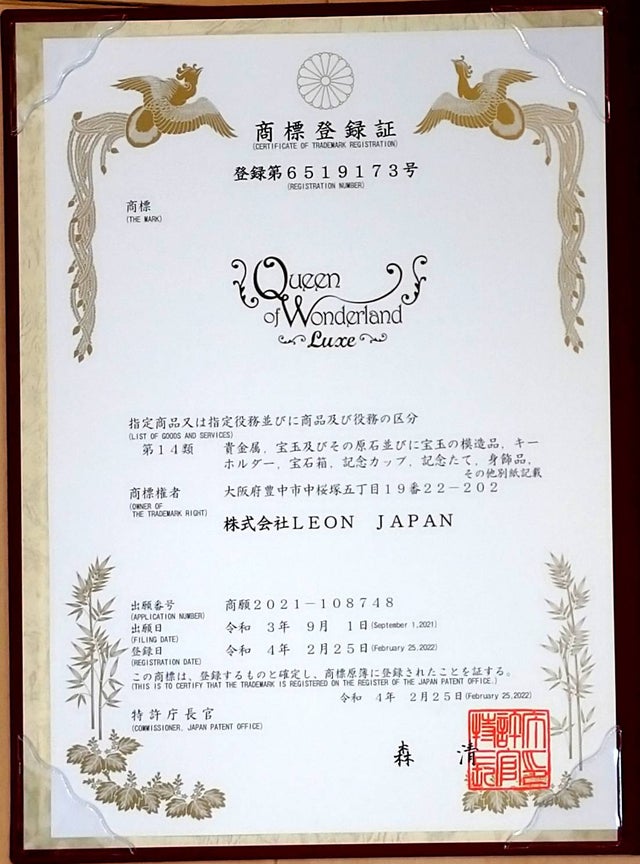 「Queen of Wonderland Luxe」(クイーンオブワンダーランドラグゼ)のブランドを守っていくために、「協明国際特許業務法人」の沖本弁理士ご協力の下、無事に商標登録完了いたしました。