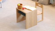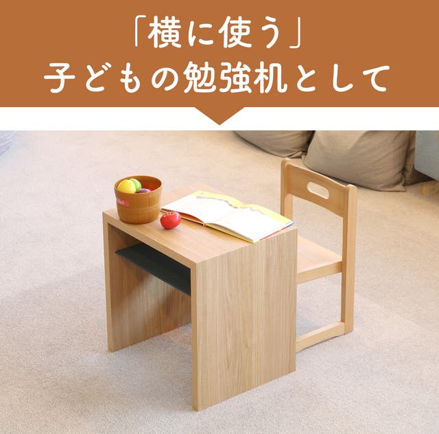 テーブルを横に倒したら、子どもの「勉強机」としても利用できます。テーブル下の仕切り板にも、本や筆箱などが収納可能です。