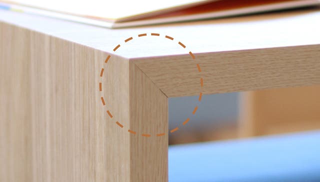 両方の木口をそれぞれ45度にカットして組み、木口を外に出さない接合方法です。木材同士の接着面が多いため、強度が強くなり、見た目もすっきりとした印象に。強度が強くなるので、長くお使いいただけます。