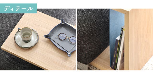 中に仕切りがついていることで、“置く”テーブルから、“しまう”が出来るテーブルに。収納の役割も。