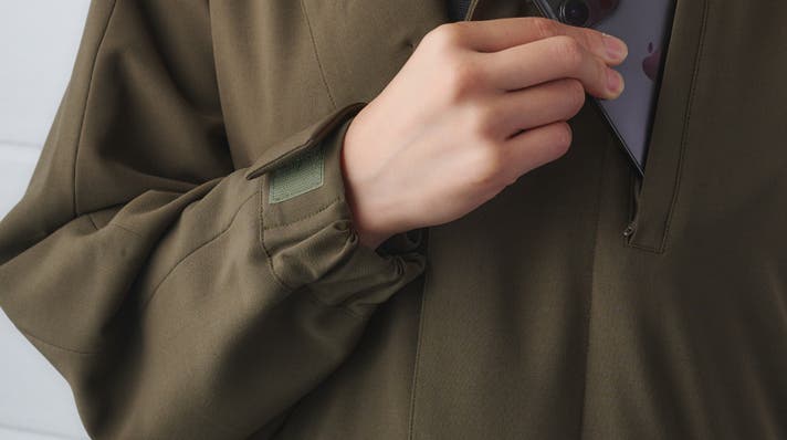 袖口には面ファスナーを採用。きゅっと締めれば防寒性やきちんと感が高まり、ゆるめればリラックスした印象に。シーンや気温に応じて、着方のアレンジを楽しめます。