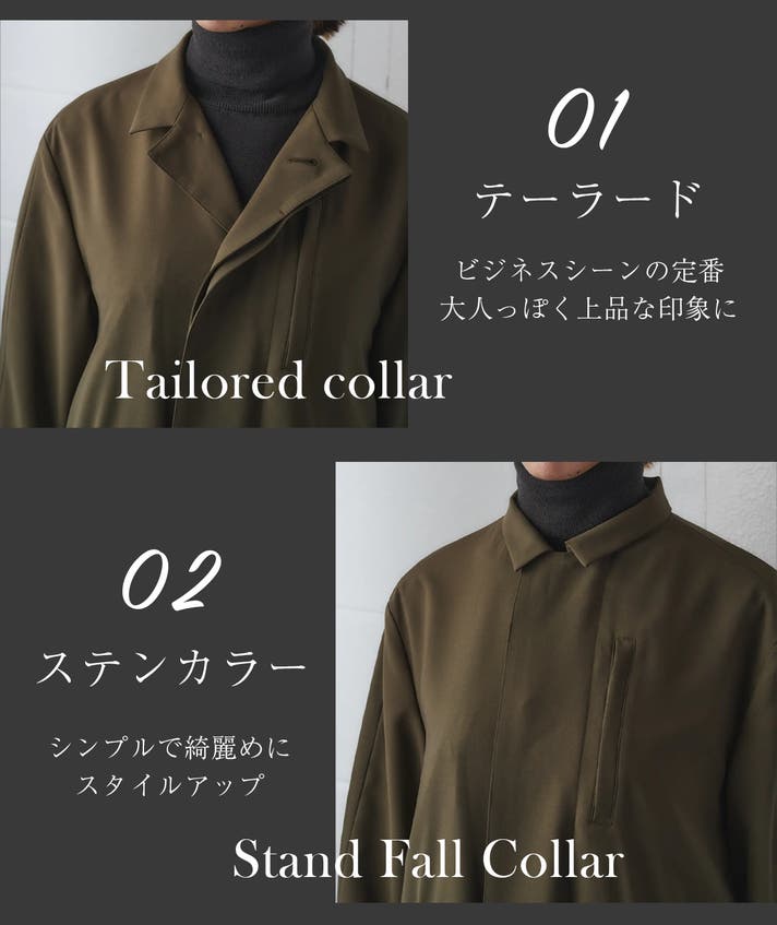 襟元は「テーラードカラー」と「ステンカラー」の2Way仕様。