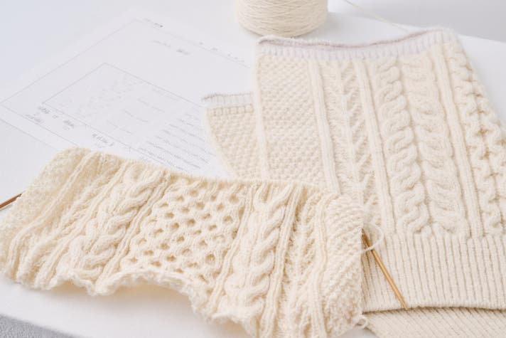 模様編みは、実際に手編みで編み方を考えながらデザインしています。