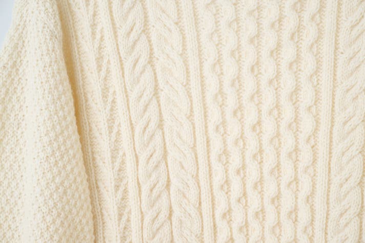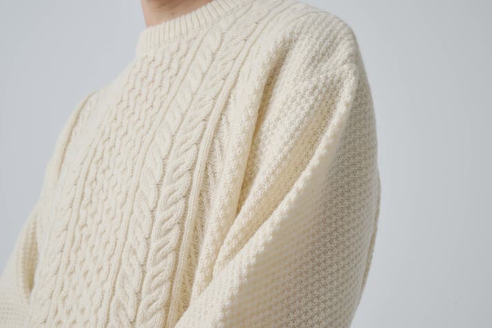 実際に棒針や手編み機で試し編みを重ね、立体模様が最も美しく見える太さと撚りを探り、国内工場で丁寧に仕上げています。