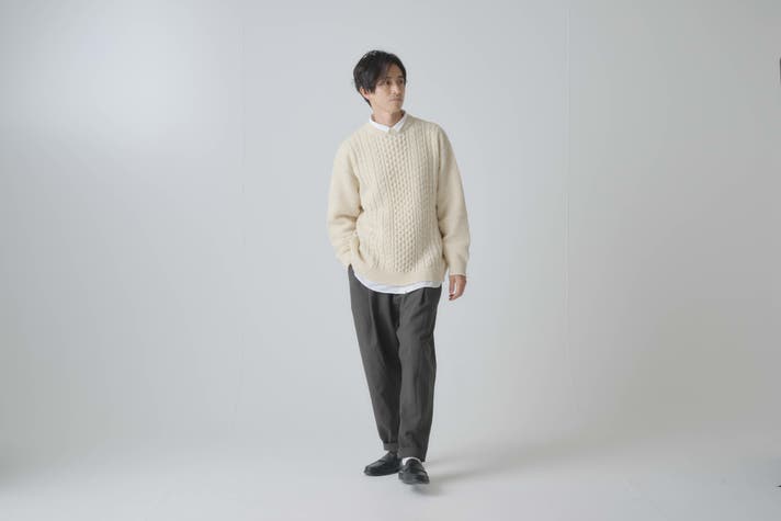 このバルキーな質感こそが、かえってヴィンテージニットで見られるような、素朴で凜とした雰囲気を携えます。シルエットがしっかり出るので、カジュアルになりすぎずビジネスシーンでもスタイルよく着ていただけます。