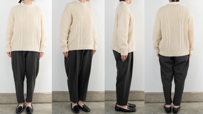 ニットセーターにありがちな、着膨れして見える、カジュアルになりすぎる。といった悩みも、このセーターなら心配ありません。