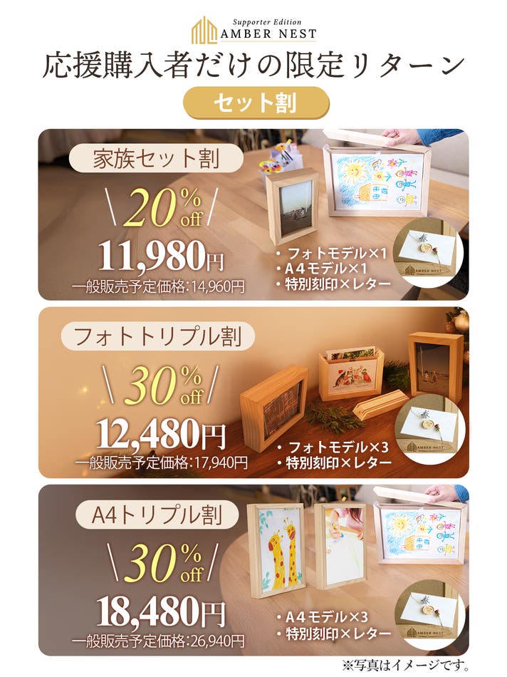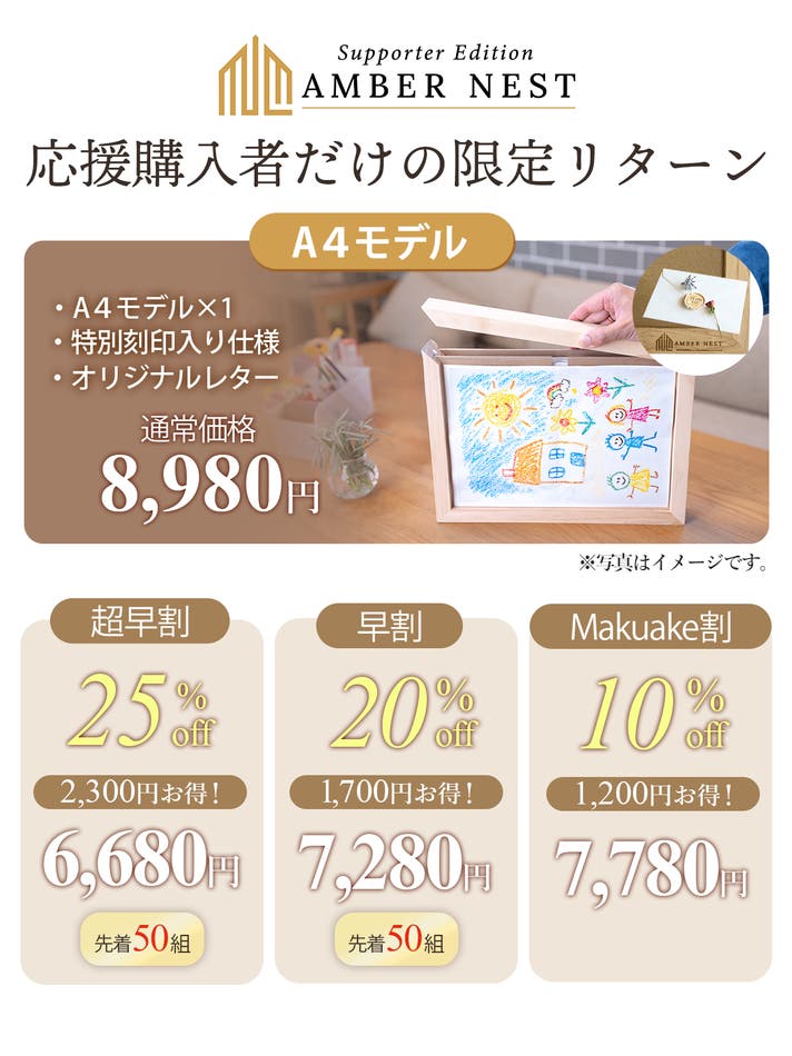 お子さまの作品やペット写真を“飾りながら残す”体験を、特別価格でいち早くお楽しみいただけます。
