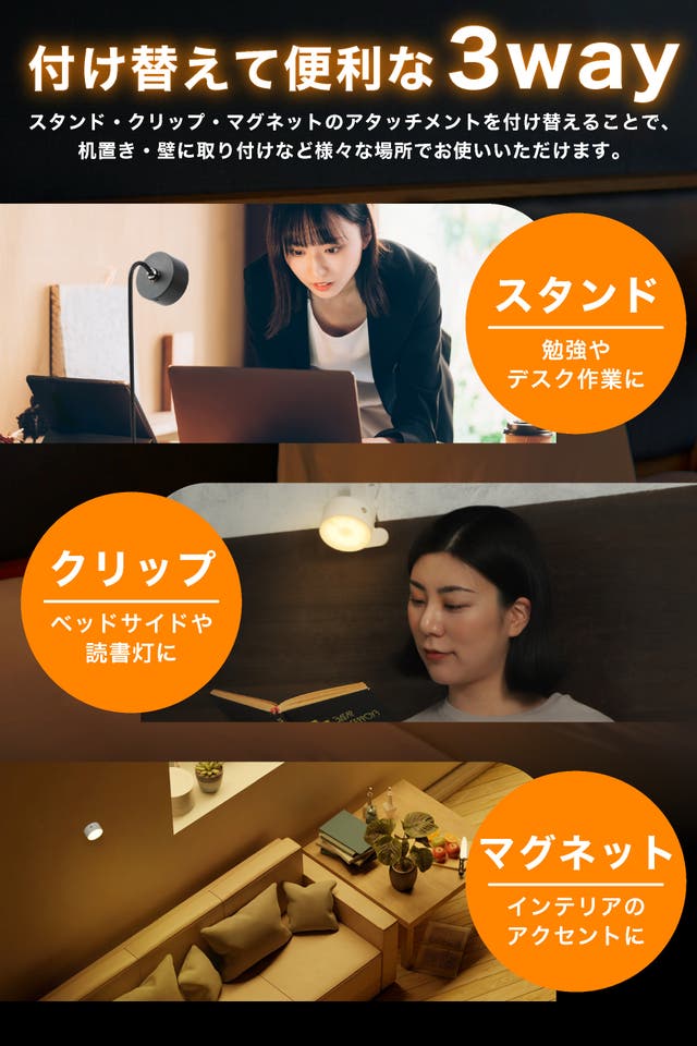 ◯目に優しい温暖色!嬉しい充電式で付け替えも簡単!