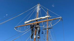 (写真:マストのクリストファーまでボースンチェアで登り、ニスがけをする溜船長)