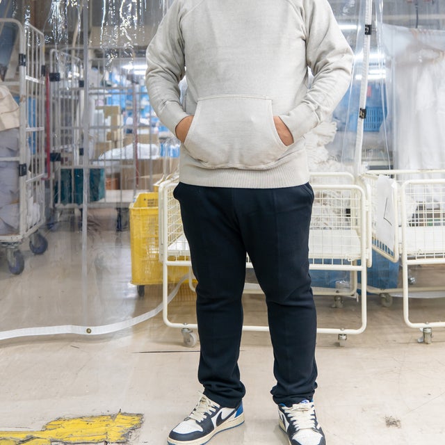 製造工程の中で、一般的にはあまり行われない3度の乾燥工程(トリプルタンブラー)をすることで、洗濯しても縮みやほつれが少ない仕上がりになります。また、表面が少し毛羽立った独特な風合いが生まれるのが特徴です。