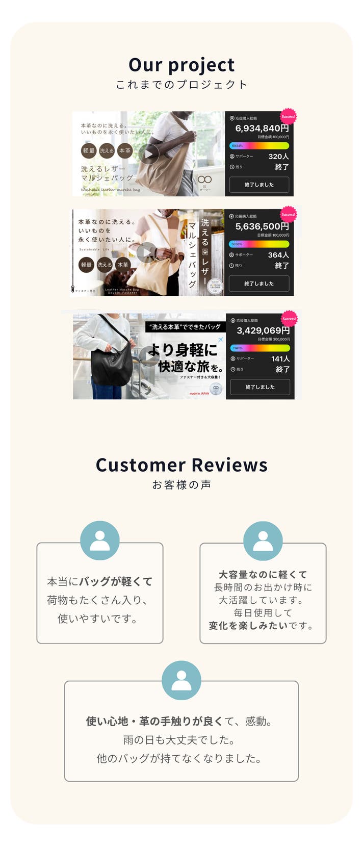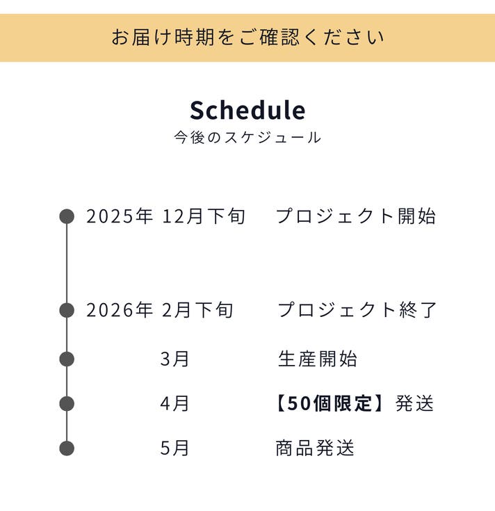 ※商品製作工程において、デザイン・仕様が一部変更になる可能性がございます。 ※原則として、サポーター様都合によるキャンセル・返金は承っておりません。 (サポーター様都合のキャンセル不可の例:デザインやサイズ感・使い勝手がイメージと違ったなど) 対応条件: 商品の初期不良、またはお届けした商品がご注文内容と異なる場合、到着後10日以内にプロジェクトページの「実行者にメッセージ」よりご連絡ください。状況を確認の上、返金対応、または良品との交換対応をさせていただきます。 ⚫︎返金額: リターン金額(税込)の全額 ⚫︎返品送料/再送料: 実行者負担 【返品・交換をお受けできない商品】 ・サポーターの責任により破損、汚損が生じた商品 ・商品のタグ、付属品、パッケージ(箱、袋など)を紛失、破棄された商品 ・事前にご連絡をいただいていない商品 ・商品到着後、11日以上経過した商品 【交換をお受けできないケース】 ・限定品や同一商品の在庫がない場合など、代替品をご用意できない商品 ※本文中に記載させていただいたスケジュールは、あくまでプロジェクト公開時点の予定です。プロジェクト開始より生産を開始させていただきますが、想定を上回る応援購入の申し込みがあった場合、また製造工程上の都合や配送作業に伴うやむを得ない事情により、お届け予定日が遅れる場合がございます。 原則として、配送遅延に伴う応援購入のキャンセルはできませんが、リターン配送予定月から3ヶ月を超えた場合には、希望者に限りキャンセルにて対応させていただきます。 ※上記のようにプロジェクトページに記載している内容に変更がある場合は、出来るだけ早く活動レポートなどで共有を行っていく予定です。 上記の注意点につきましてあらかじめご理解とご了承いただいた上で応援購入いただきますよう、宜しくお願い致します。