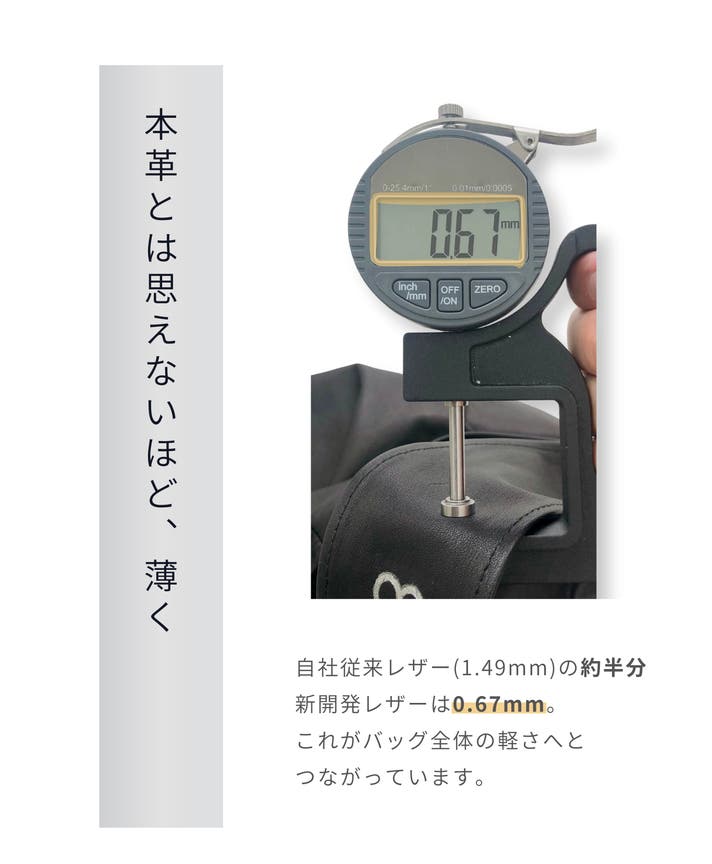 新しく開発したレザーはわずか0.67mmで、従来のおよそ半分の薄さでありながら、革本来の風合いやしなやかさはそのままに仕上げました。