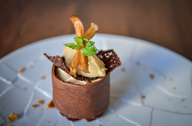 塩キャラメルのエスプーマ 牛蒡のソルベを添えて