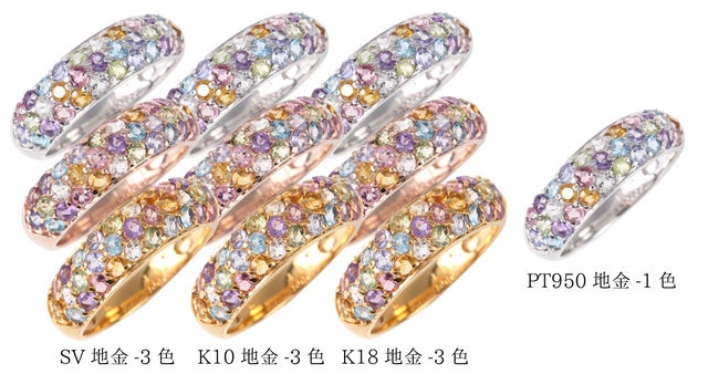 ■「天然石の配置」石決めから配置を決めるまで数か月の試行錯誤を繰り返した結果デザイナー曰く独自の黄金比ともいえるパターンを採用!上述したような宇宙一の輝きには合計何カラットの石が必要だろうか?石のサイズはどうしよう?色彩のバランスを考慮した天然石とは何か?など幾度となくスケッチを繰り返してパターンを試行錯誤すること数か月。デザイン・輝き・色彩・バランスにマッチする石種は、アメジスト×5石、ピンクトルマリン×5石、ブルートパーズ×5石、タンザナイト×4石、ペリドット×4石、シトリン×4石、ホワイトトパーズ×4石の7種類×計31石仕様のサイズ直径2mmに決定!上品かつ生命力みなぎる輝き・色彩はデザイナーM氏が培ってきた経験と才能で生み出されました!
