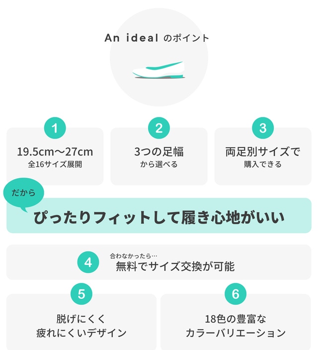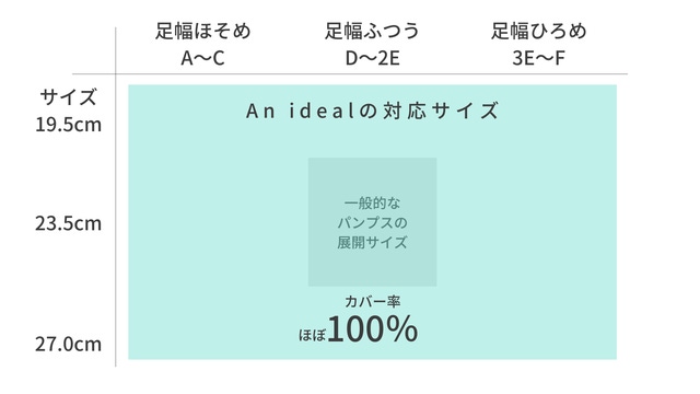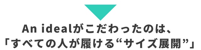 「足のサイズは大きいのに、幅が狭くてかかとがパカパカしちゃう…」など、足長サイズだけでは対応できないというお悩みも、An idealでは解決することができます。