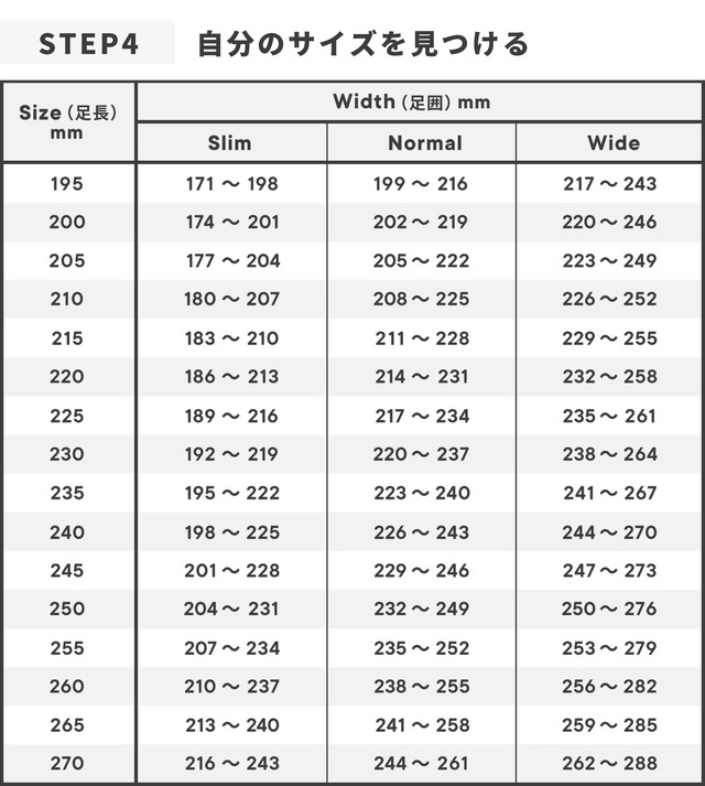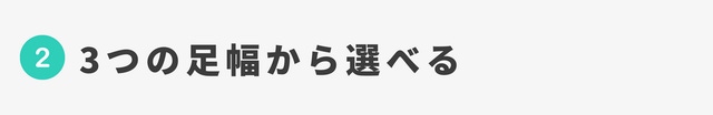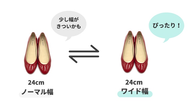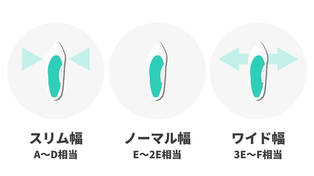 足長サイズだけでなく、「スリム幅」「ノーマル幅」「ワイド幅」の3種類の足幅から自分好みの履き心地を選べます。