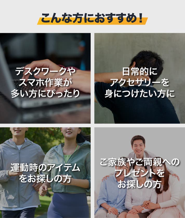 首や手首に負担をかけない軽量設計で、日常のどんなシーンでも快適に使えます。