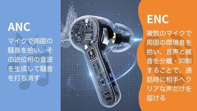 ENC(環境ノイズキャンセリング):集音時の周囲ノイズを低減する機能で、主に通話時に使用されます。