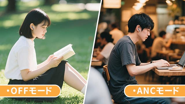ノイズキャンセリング(ANC/ENC)機能により、周囲の環境に応じて「ノイズキャンセリングON/OFF」を自由に切り替えられます。