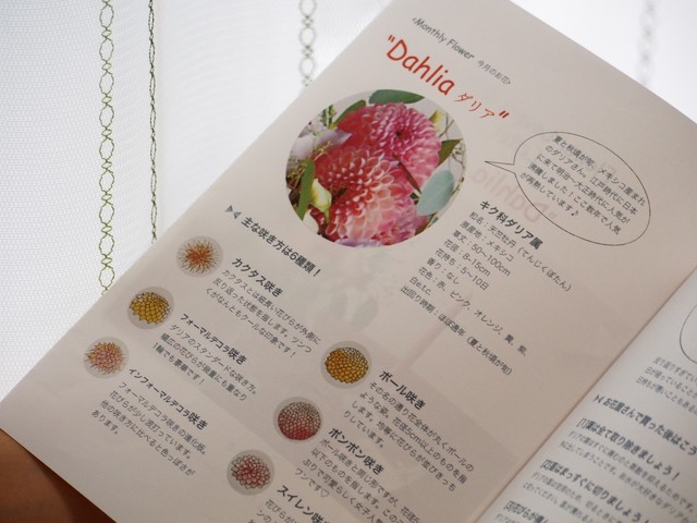 また、お届けのお花やグリーンについてのマメ知識や扱い方、飾り方などをまとめたお洒落なレターも同封し、1年(12ヶ月)で一通り季節のお花やグリーンについて知ることができます。
